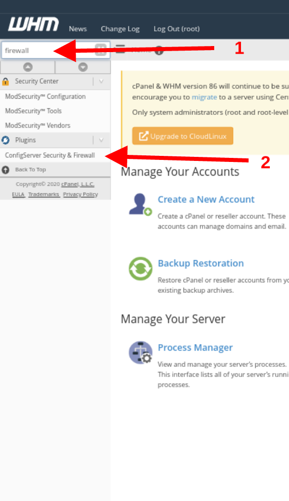 Para desbloquear ou bloquear um IP no seu WHM, basta fazer login e seguir as instruções numéricas a seguir: