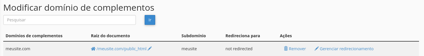Após realizados os passos indicados acima, clique em "Adicionar Domínio". O domínio recém criado aparecerá listado na parte 'Modificar domínio de complementos":