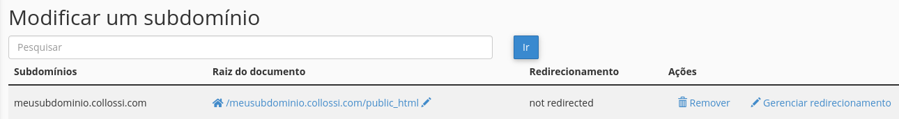 Agora basta clicar em "Criar". O subdomínio recém-criado aparecerá na parte "Modificar um subdomínio":