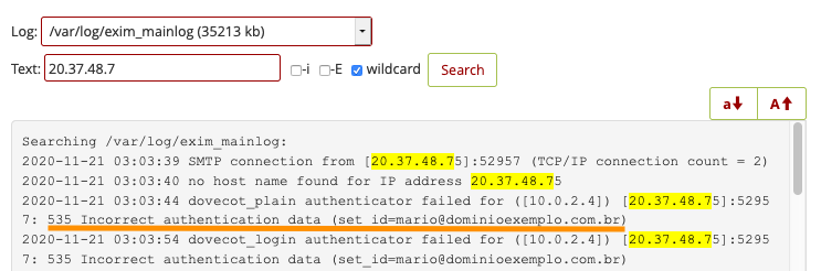 - Na tela de filtros para pesquisar, nos arquivos de log sobre um IP, os erros relacionados a e-mail devem ser feitos nos arquivos de log /var/log/exim_mainlog