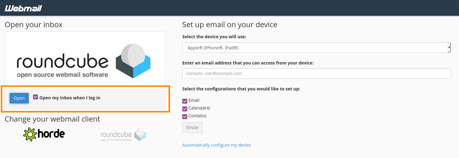 2. Caso você esteja acessando seu Webmail pela primeira vez, você poderá escolher uma interface "RoundCube" ou "Horde"