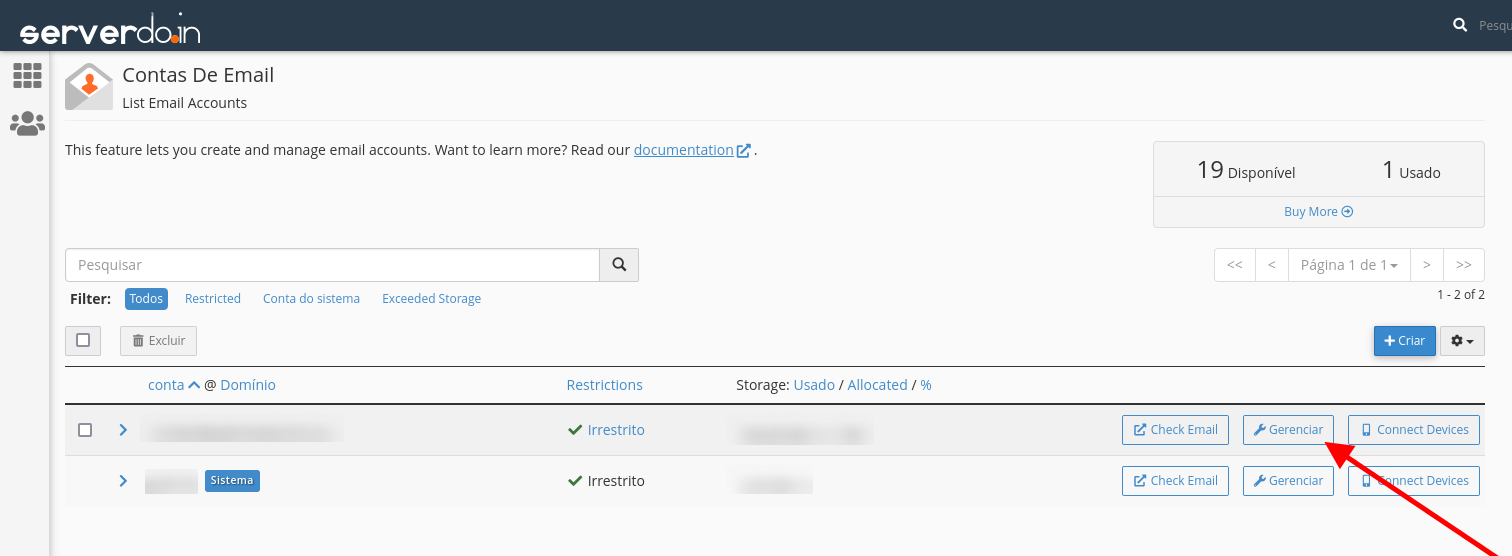 • Escolha o email que quer alterar a senha e clique em "Gerenciar"