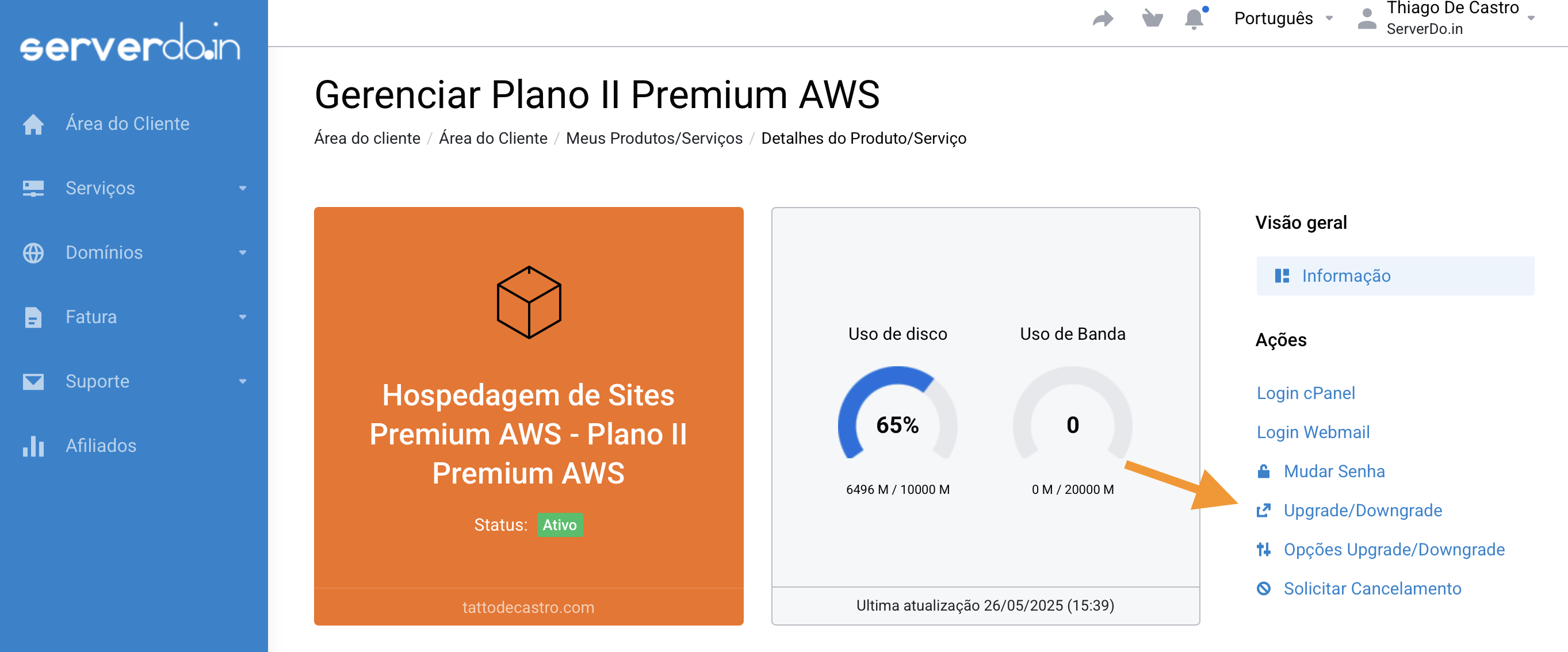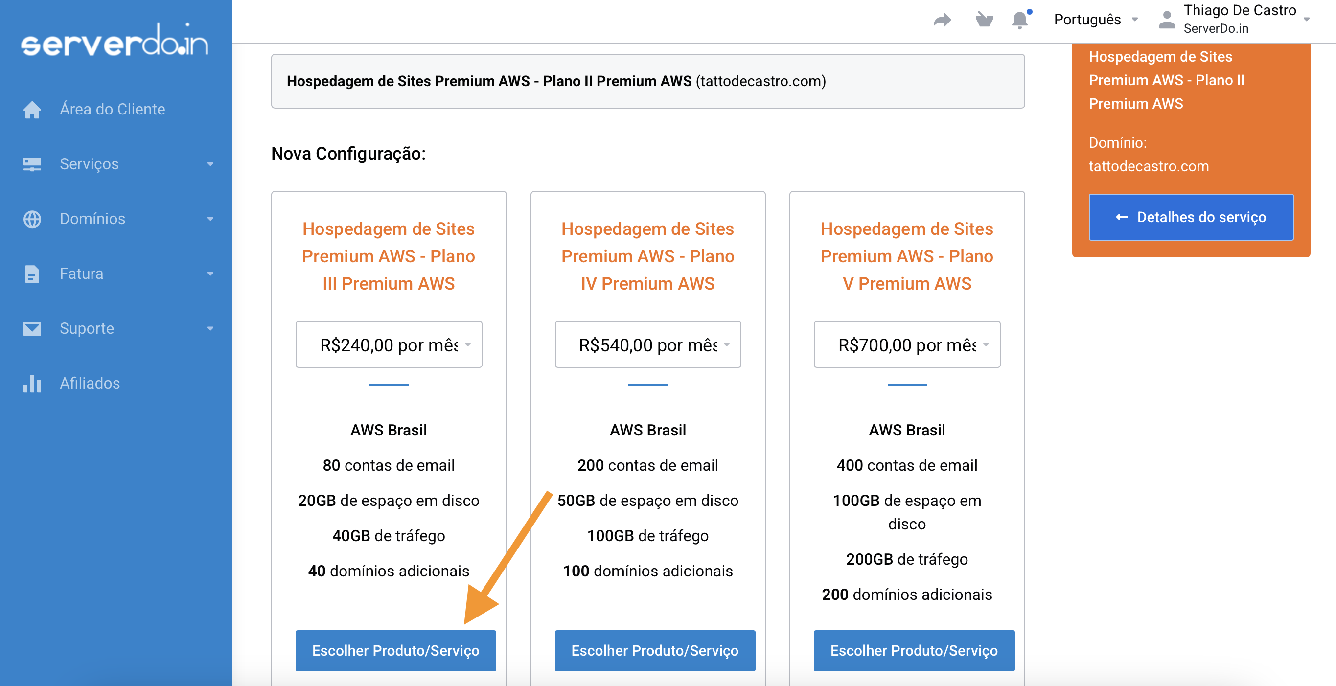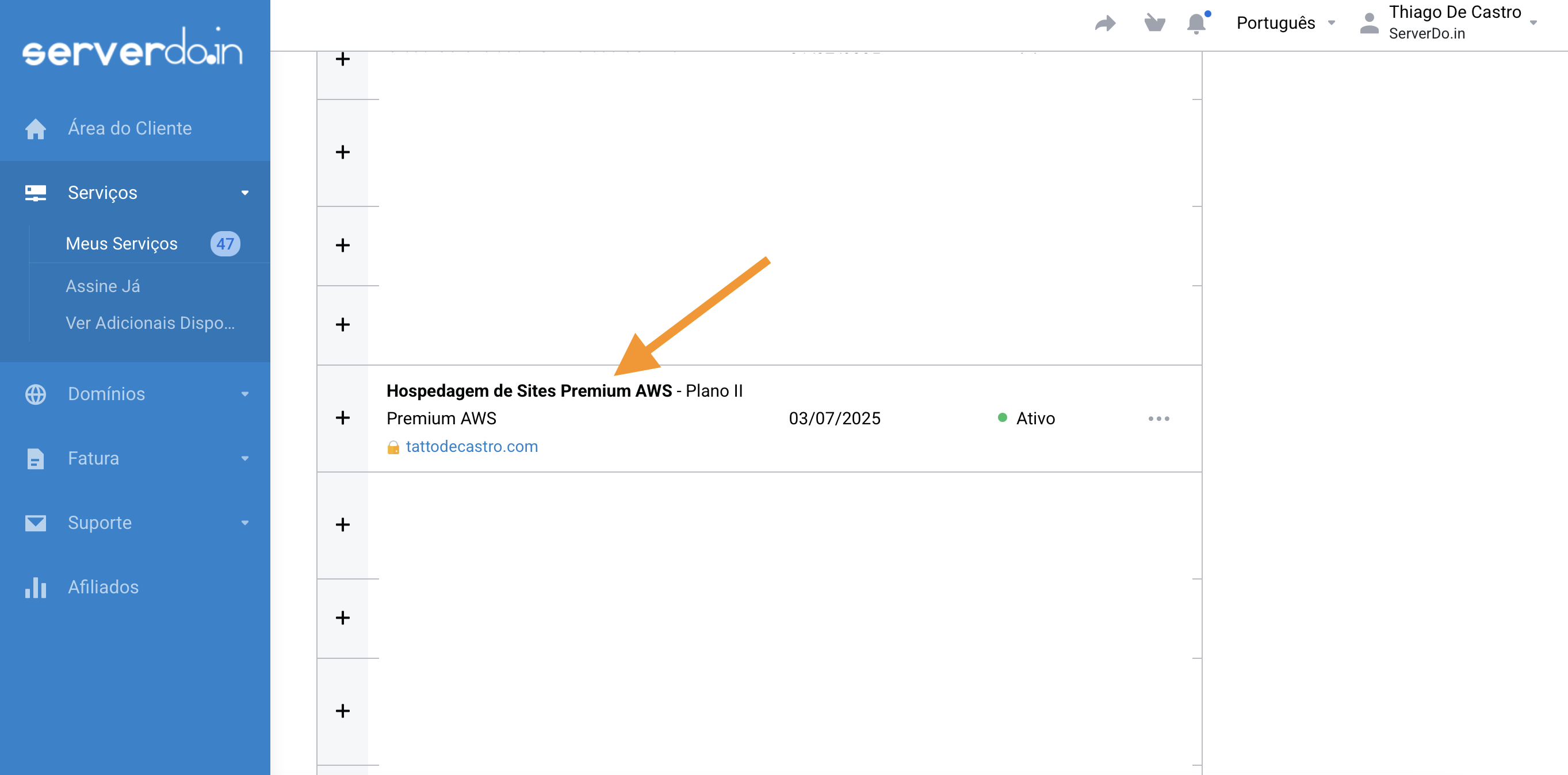 Clique sobre o domínio que deseja fazer contratar o adicional (ex: tattodecastro.com).