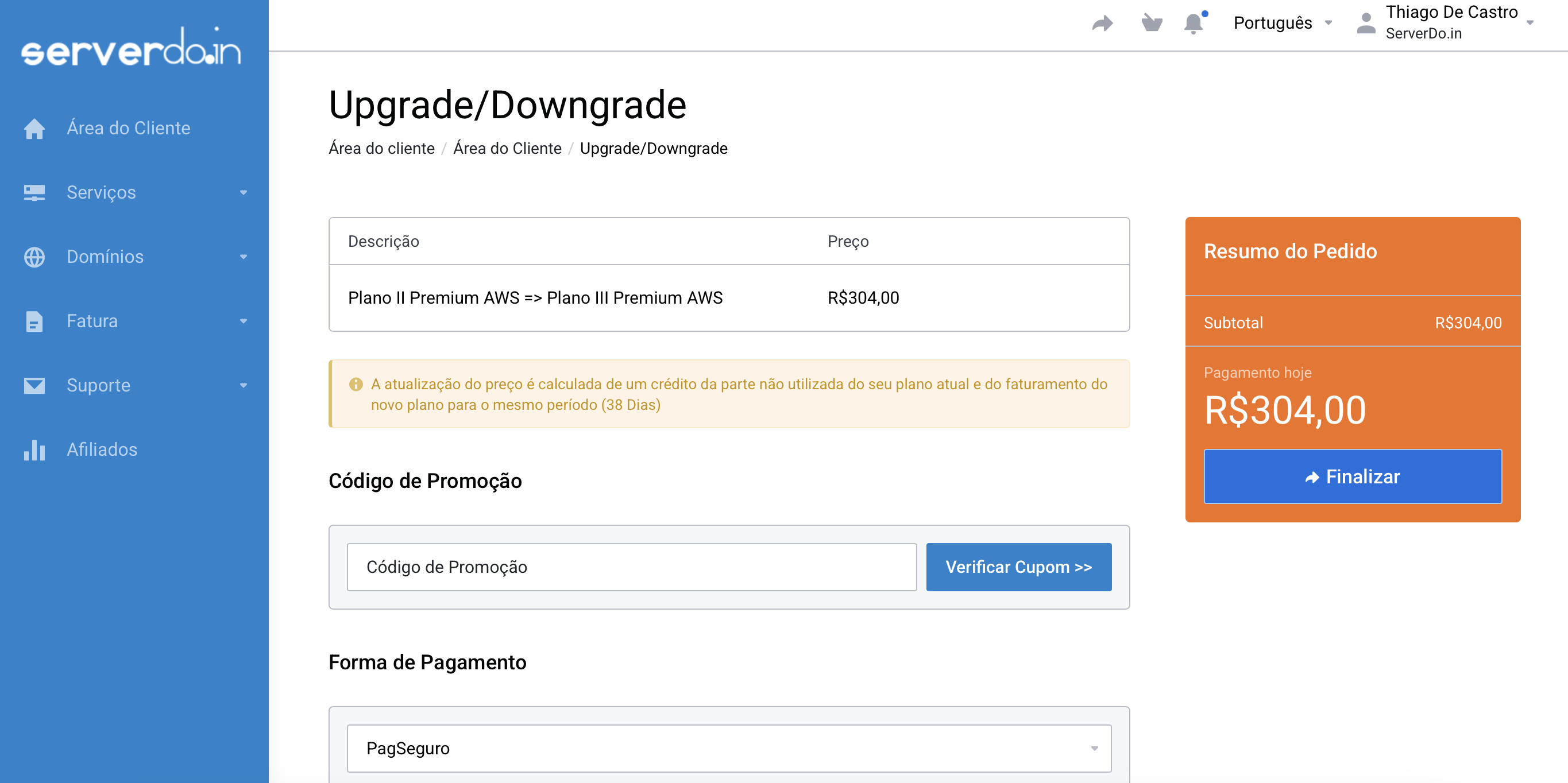 No final do processo será gerada uma fatura com valor proporcional até seu próximo vencimento.